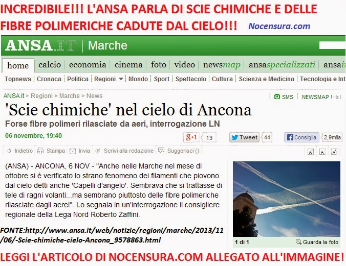 Anche nelle Marche nel mese di ottobre si e’ verificato lo strano fenomeno dei filamenti che piovono dal cielo detti anche ‘Capelli d’angelo’. Sembrava che si trattasse di tele di ragni volanti…ma sembrano piuttosto delle fibre polimeriche rilasciate dagli aerei. Questo e’ quanto segnalato in un’interrogazione dal consigliere regionale della Lega Nord Roberto Zaffini.